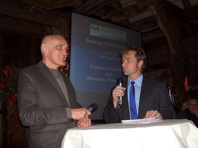 Die diesjährige Innungsversammlung in der Festscheune auf Meyers Hof im Zoo Hannover war bis auf den letzten Platz gefüllt. Mehr als 150 Mitglieder und Gäste sind unserer Einladung gefolgt. Obermeister Sensing konnte unserem prominenten Gast, dem Präsidenten von Hannover 96 Martin Kind, im kurzweiligen Gespräch einige Details zu Hannover 96, der Firma KIND und dem Menschen Martin Kind entlocken. Weitere Höhepunkte waren die Auszeichnung der Sieger des Fassadenwettbewerbs 2014, die Ehrung der Mitglieder und der diesjährigen Jungmeister. Ein gelungener Abend fand bei Musik und vielen Gespächen ein spätes, harmonisches Ende.